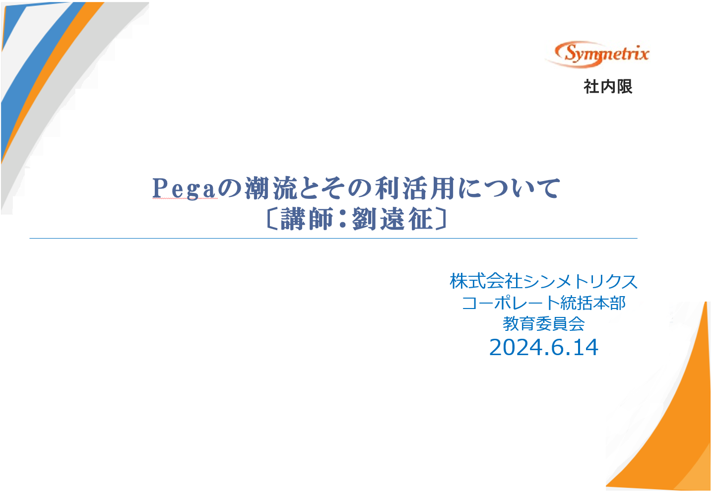2024.6.14 「Pega Platformの潮流と利活用」をテーマとして、第1回技術講習会を開催しました。対象は、シンメトリクス社役職員。創業より掲げる教育研修の整備、さらなる充実を図るための施策の一つです。事務局は今期よりコーポレート統括本下に機構改革により配置し、教育研修・人材開発領域を担う「教育委員会」です。会場は関東IT健康保険組合施設会議室にて、会場には20名。オンラインで同時配信し加えて、社内のナレッジプールとして後日聴講できるように整備いたしました。